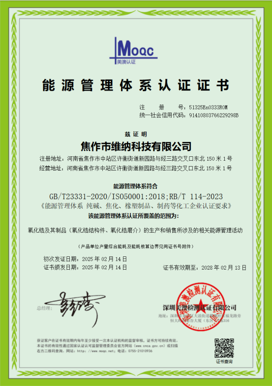 能源管理体系认证是基于国际标准ISO 50001和国家标准GB/T 23331的权威认证,它不仅证明公司在能源使用、消耗及效率等方面的管理措施和实践均达到标准水平,更是对公司长期以来节能减排、提高能源绩效的充分认可,也是其在节能减排和提高能源绩效方面取得成效的重要标志。
